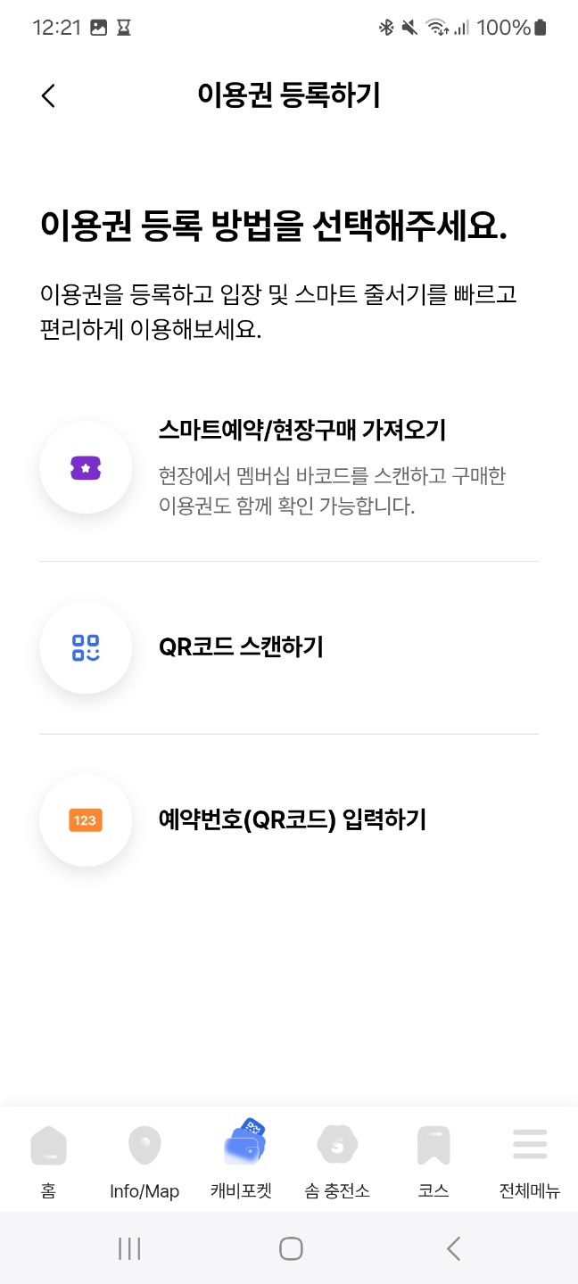 - 입장 전 반드시 앱에서 QR 코드 화면을 미리 실행해 두는 것이 좋습니다.