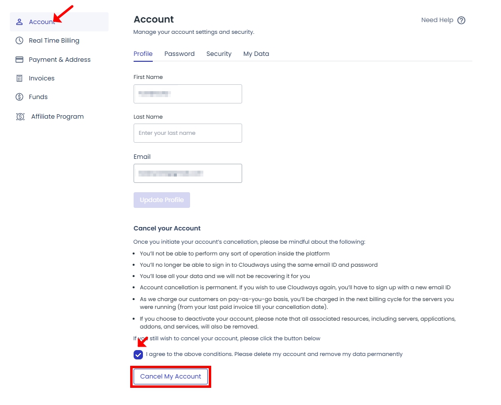 🔎 어카운트에 들어가서 하단으로 내려서 동의를 체크 후 Cancel My Account를 누릅니다.